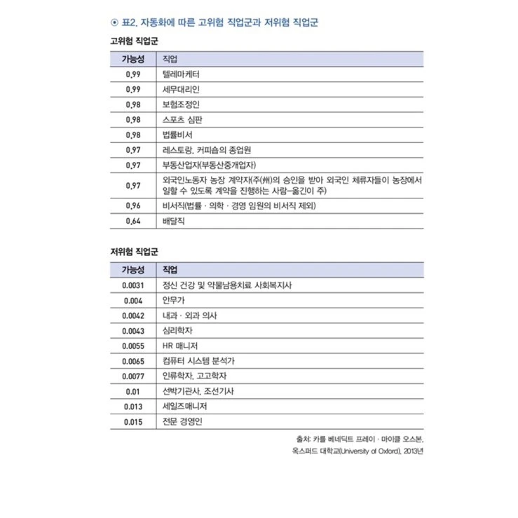 클라우스 슈밥의 저서 ‘4차 산업혁명’ 에서 자동화에 따른 고위험 직업군과 저위험 직업군을 볼 수 있다. 꼭 이 표가 아니더라도 미래에 사라질 직업군과 살아남을 직업군을 논하는 칼럼을 한번쯤은 봤을 것이다.