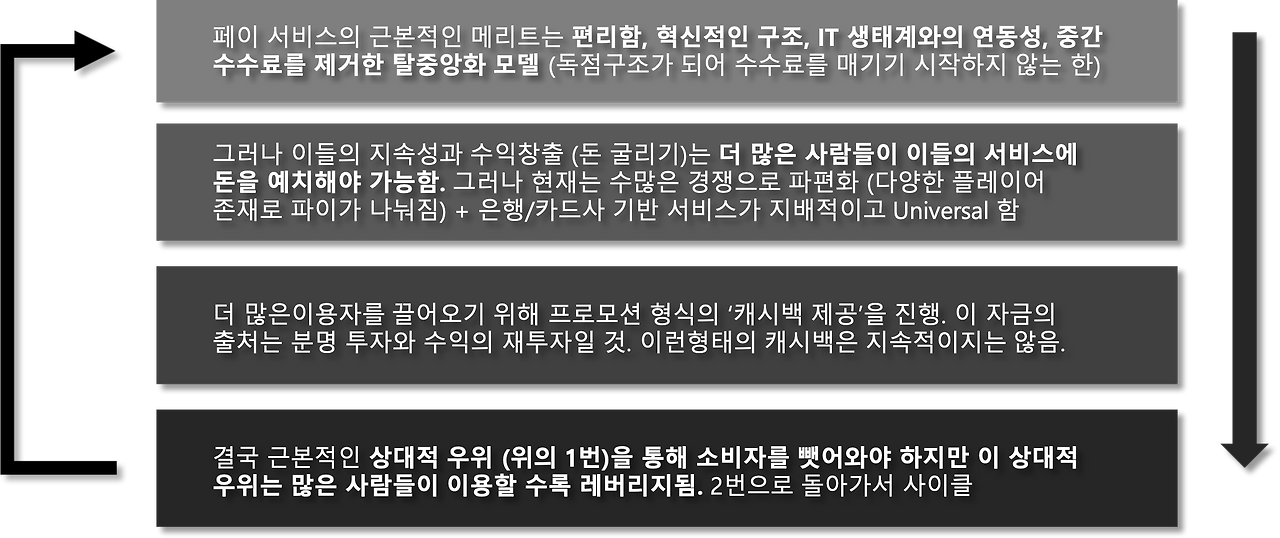 - 페이 서비스들 역시 위의 사이클에서 벗어나지 못하는 한 기존 금융서비스를 이기기 어렵다 판단 >> 더 완강하게 버틴다. (결국 레버리지 할 만큼 소비자들이 충분히 넘어오는 것보다, 캐시백 등의 프로모션 - 위에서 말한 당근 - 이 바닥나는 것이 빠를 것이라 판단하고 완강히 버틴다).