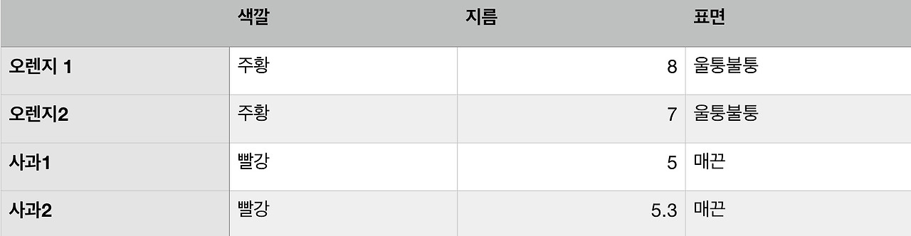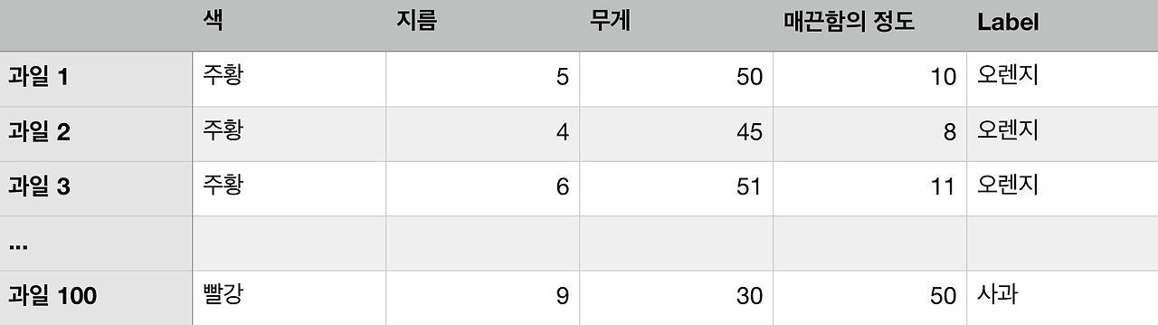아마 머신러닝을 접한지 얼마 되지 않은 이들인 이게 무슨 소리인가 싶을 것이다. 알기 쉽게 설명하기 위해 위에서 언급했던 사과와 오렌지의 예시를 다시 들어보겠다. 여기서 우리는 우리가 구별하고자 하는 것이 무엇인지 알고있다 - 오렌지와 사과를 구별하고자 하는 것이다. 다시말해, 우리가 머신러닝을 통해 구별하고자 하는 것의 답에는 범위가 '오렌지 아니면 사과'로 정해져있다. 따라서 '오렌지'와 '사과' 가 '레이블 (Label)이 되며 이는 지도학습에 해당한다. 위에서는 간단한 설명을 위해 '울퉁불퉁함', '매끈함'과 같은 수식어를 사용하여 데이터를 간단히 표현했지만, 실제 머신러닝을 이용해 사과와 오렌지를 구분하기 위해서는 사과와 오렌지의 특징 (feature)를 더 세세히 '데이터화'해야 한다. 예를들어, '매끈하다', '울퉁불퉁하다' 와 같은 추상적인 표현은 '매끈함의 정도'라는 항목을 만들어 수치화하던지, 그게 불가능하다면 '매끈함의 여부' 라는 항목으로 대체해 yes = 1, no = 0 으로 표현함으로써 코드화해야 한다. 그러면 오렌지와 사과를 구별하도록 기계를 '학습'시키기 위해, 우리는 다음과 같은 형태의 데이터셋이 필요하다.