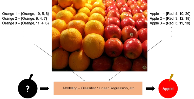 이 100개의 데이터셋은 어느것이 '오렌지'이고, 어느것이 '사과'인지 답이 정해져있는 데이터셋이며, 이 데이터에 포함된 사과와 오렌지의 특징(feature)값들을 특정 알고리즘을 통해 학습하여 사과와 오렌지를 구분할 수 있는 모델을 만들어낸다. 이 100개의 데이터를 포함한 데이터셋을 'Training Data'라고 하며, Training Data 의 크기가 너무 작거나 편중되어 있다면 사과와 오렌지를 충분히 잘 구별하도록 정확히 학습하지 못할 수 있다. 지도학습의 경우 이렇게 Training data를 통해 사과와 오렌지를 구별하는 규칙을 학습하고, Training dataset 외의 과일을 가져왔을 때 이것이 사과인지 오렌지인지 구별하게 된다.
