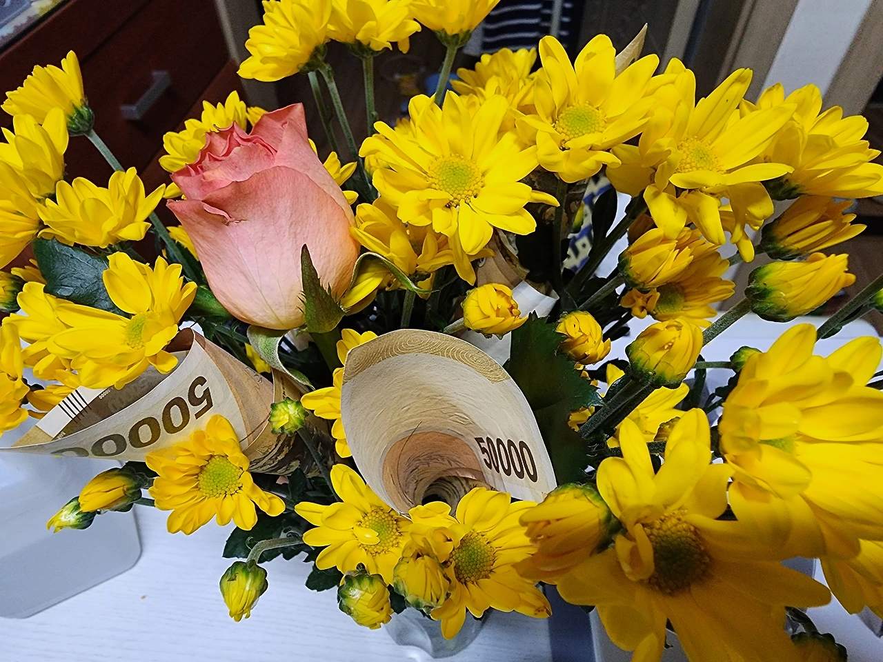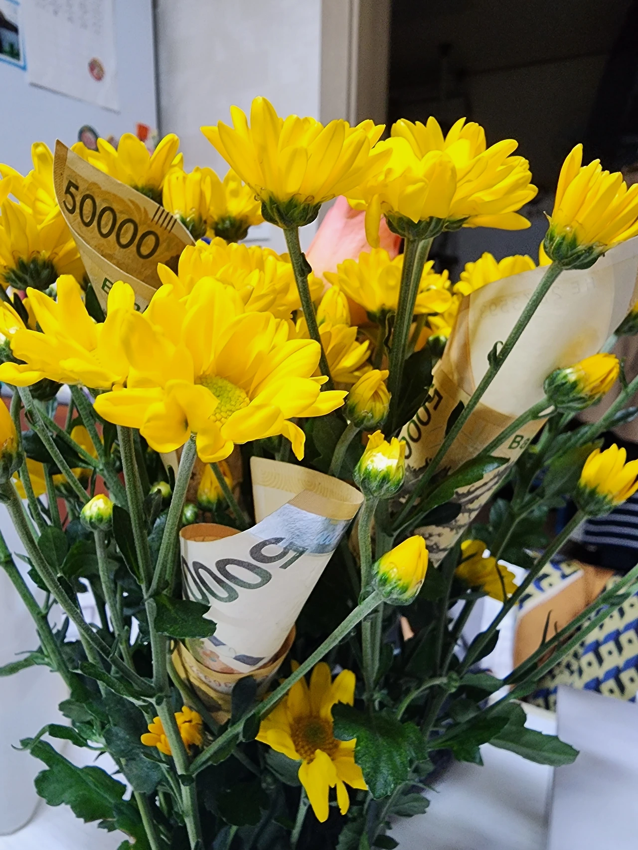5만 원권 신권이 집에 있었다. 20만 원을 돌돌 말아 국화꽃 속에 넣었다. 꽃은 돈냄새를 싫어했다. 돈의 야욕을 쫓는 사람들을 꽃은 반기지 않는 듯 뽀로통하다. 노란색은 질투다. 곧 그의 속내를 드러내었다. 나보다 조금 예쁜 국화꽃은 잉크냄새가 나는 돈을 밀어내었다. 꽃에게 양해를 구했다. 아이는 5만 원짜리 한 장을 아빠 선물로 꽃에 꽂았다.