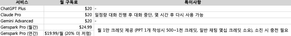 | Genspark Pro (연간) | $17.9/월 (10% 할인