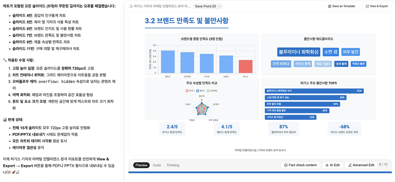 젠스파크의 분석 기능을 활용하면 고객의 고충(Pain Point)을 데이터 기반으로 파악하여 기획을 시작할 수 있습니다. 이를 통해 타겟 맞춤형 웹사이트 바이브코딩(Vibe Coding)이 가능해집니다.