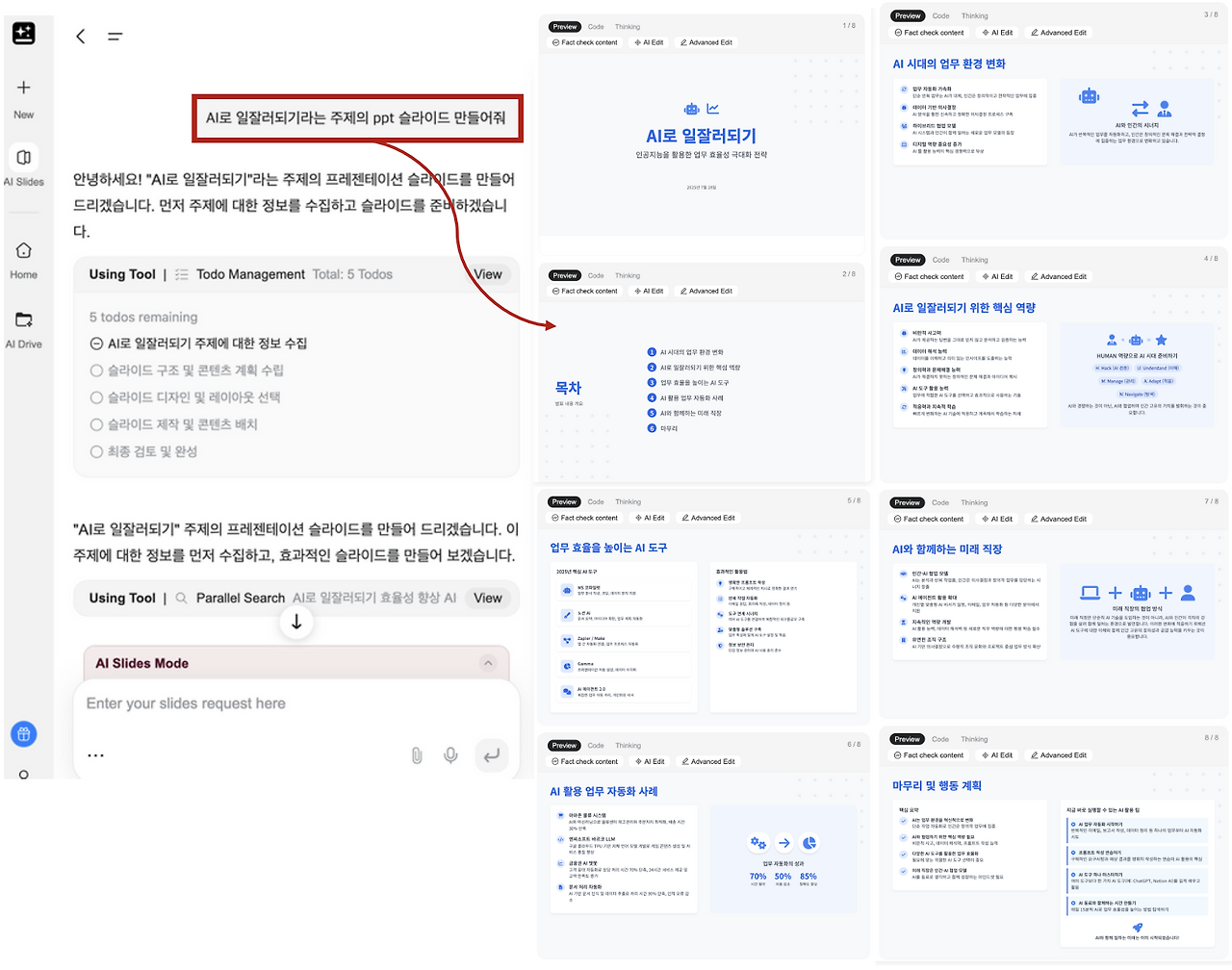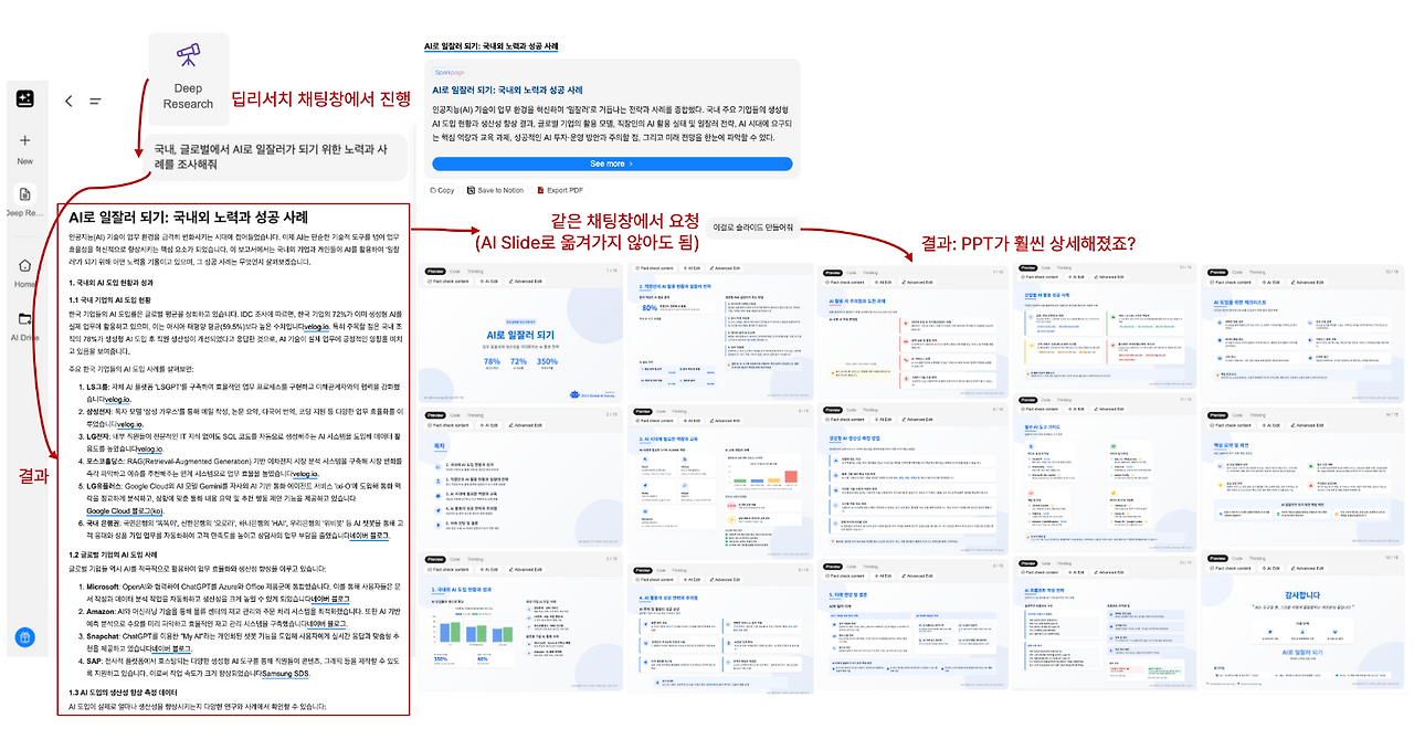 딥리서치로 상세한 내용 조사 후 AI Slide로 만들어달라고 하기