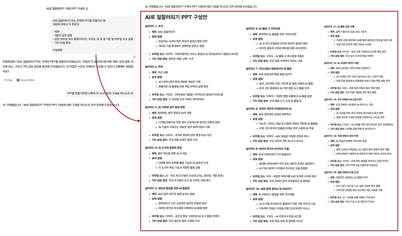 미리 목차 + 상세 내용 확정 후(AI 도움 받기) 슬라이드화 요청 (수정이 잦아질 수록 PPT 퀄리티가 저하되기 때문에