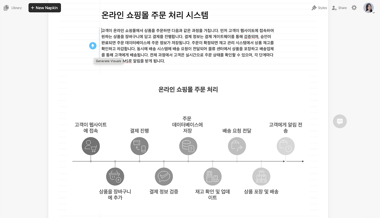 이렇게 1쪽을 위한 도표는 Napkin.ai (냅킨 에이아이)에서도 잘 만들어줍니다.