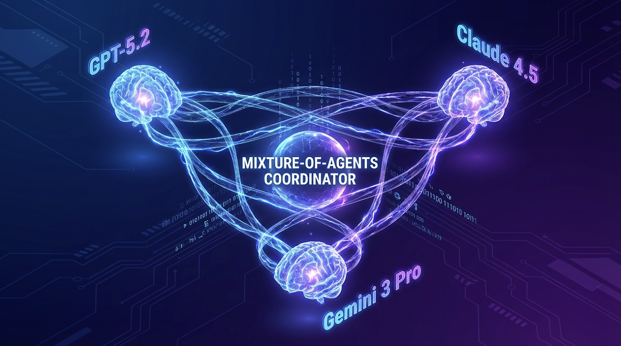 혼합 에이전트(Mixture-of-Agents, MoA) 기술을 통해 GPT-5.2, Claude 4.5 등 최신 모델의 답변을 하나의 인터페이스에서 비교하고 조합할 수 있습니다.