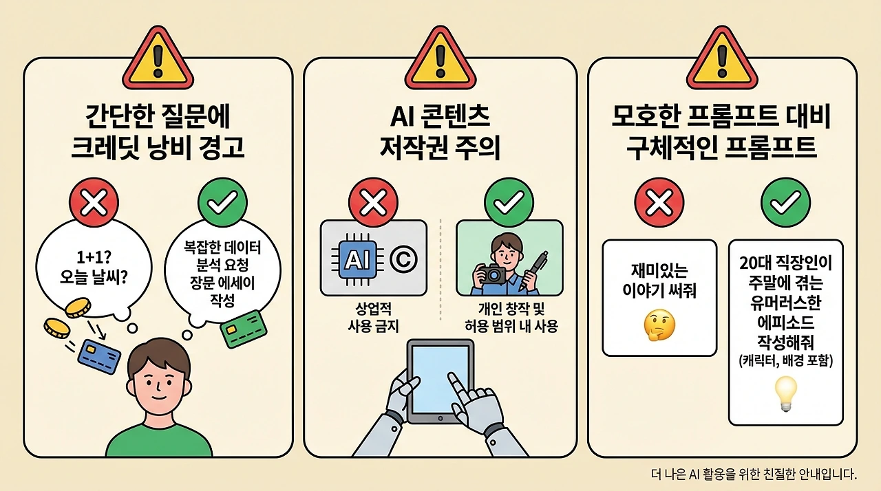 프롬프트의 모호성: "아무거나 추천해줘" 식의 질문은 AI도 혼란스럽게 합니다. "20대 여성이 선호하는 5만 원 이하의 선물 리스트 10개를 이유와 함께 알려줘"처럼 구체적으로 질문할수록 크레딧 가성비가 높아집니다.