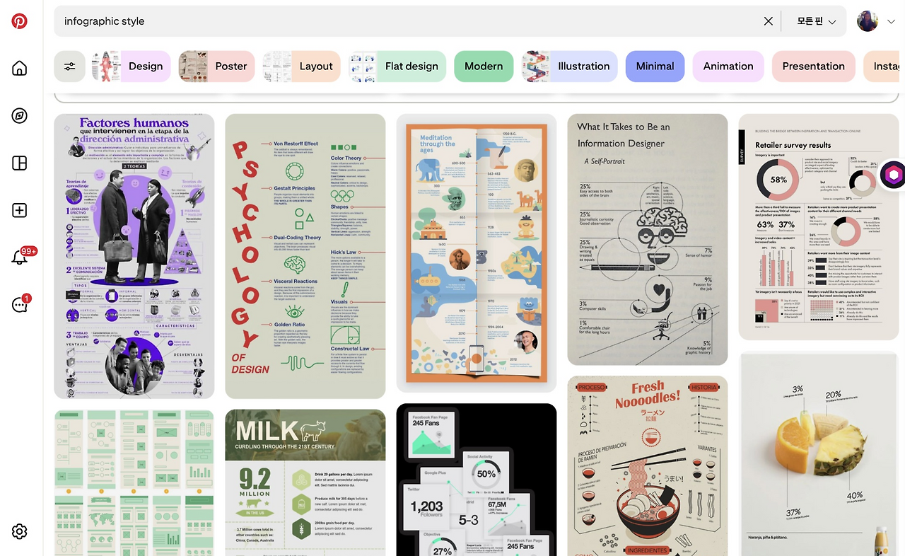 핀터레스트에서 ‘인포그래픽 스타일’을 검색한 화면에서 레퍼런스 탐색 후, 함께 제공하며 작업물을 요청하세요!