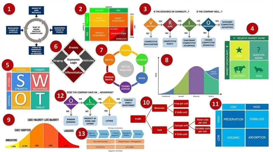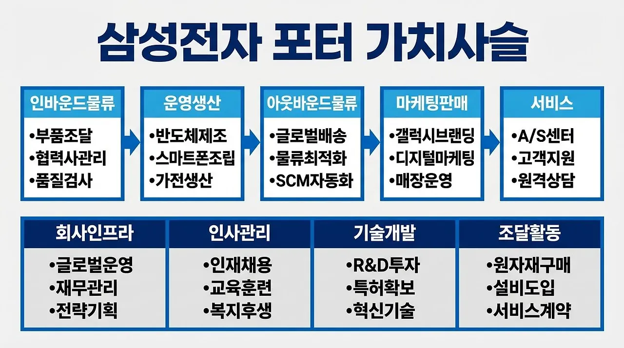 기업의 가치 창출 활동을 체계적으로 분석하여 경쟁우위의 원천을 식별하는 프레임워크입니다. 주요 활동(Primary Activities)은 Inbound Logistics(인바운드 물류), Operations(운영), Outbound Logistics(아웃바운드 물류), Marketing & Sales(마케팅 및 판매), Service(서비스)로 구성되며, 지원 활동은 기업 인프라,인적자원 관리, 기술 개발, 조달로 구성됩니다.