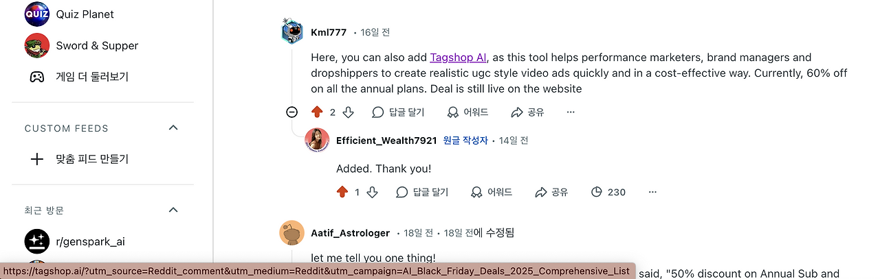 레딧 댓글에도 야무지게 트래픽 출처 UTM을 달은 것 좀 보세요...!
