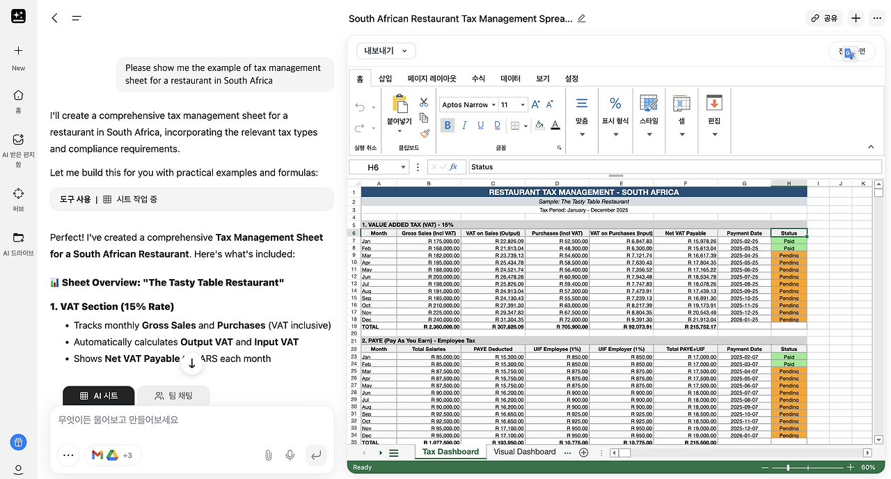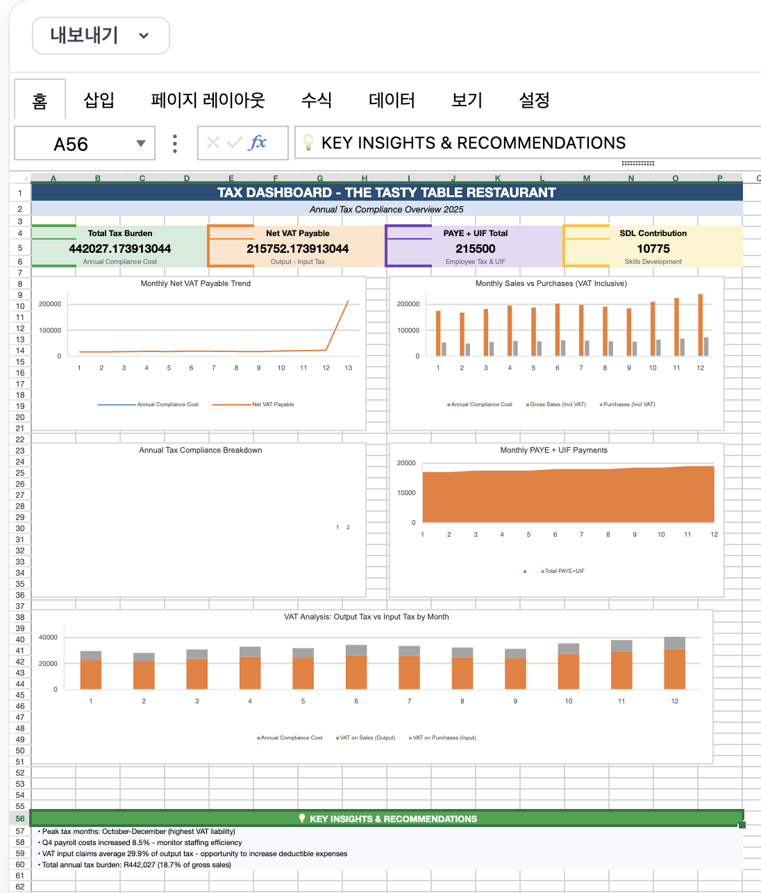 남아공의 세금 관리 시트 예시를 보여줘