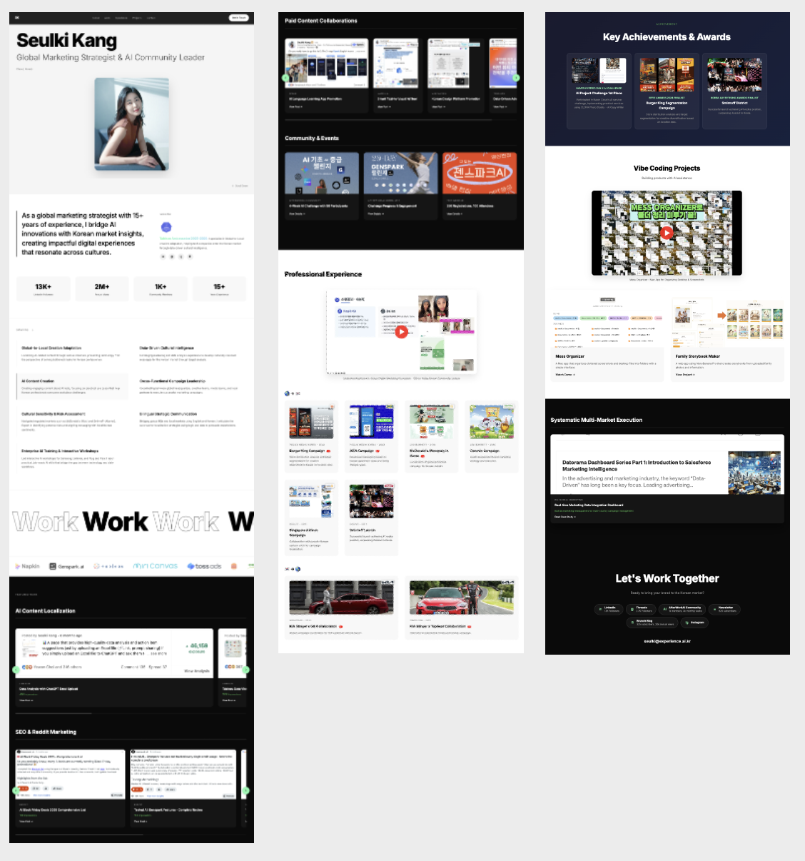 이 폴더 안의 html이랑 사진들을 이용해서 영문 포트폴리오 웹사이트를 만들어줘. 자연스럽게 요소를 배치해주고 요소 빼먹지마. 그냥 나열하지 말고 인터렉티브하게. 링크랑 영상 삽입 등 사용해서. 그리고 이 이미지를 레퍼런스로 써.