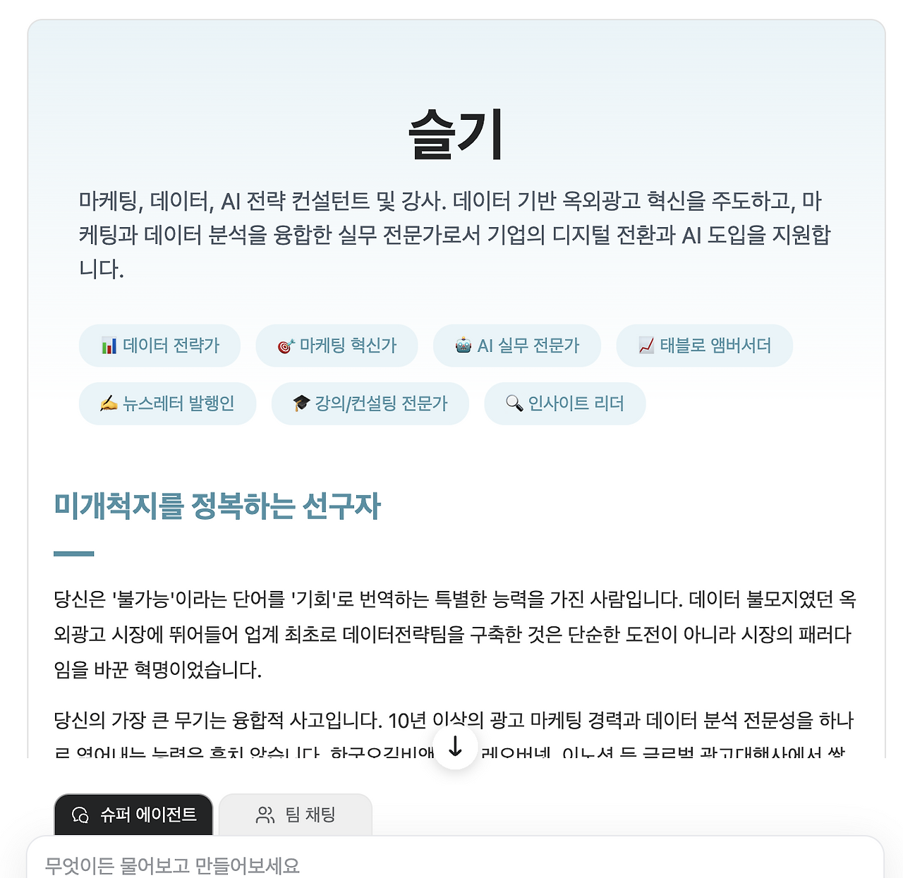 젠스파크에는 '리서치미' 기능이 있어서 저에 대한 URL을 넣으면