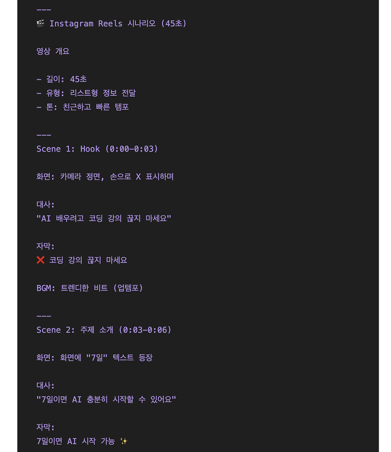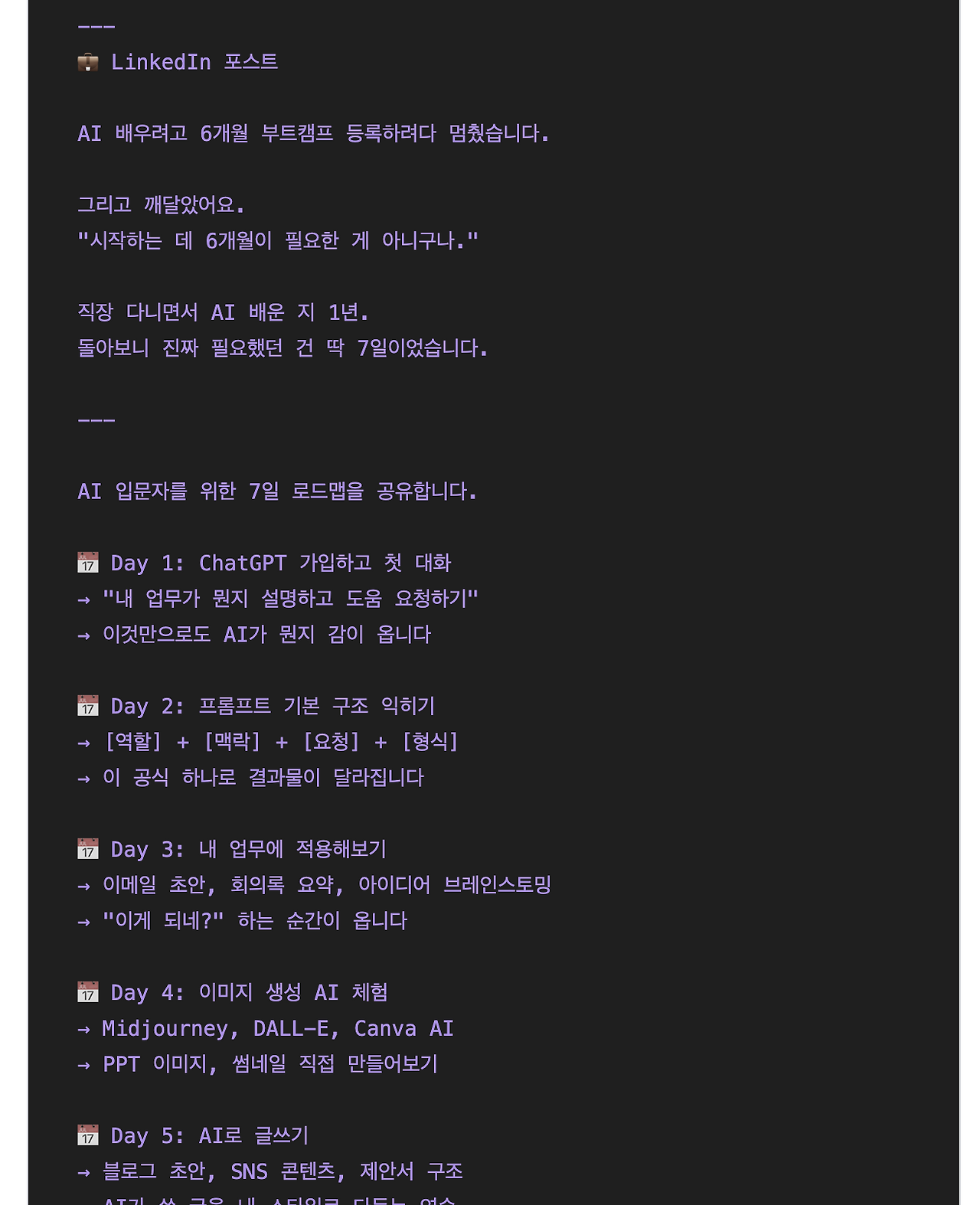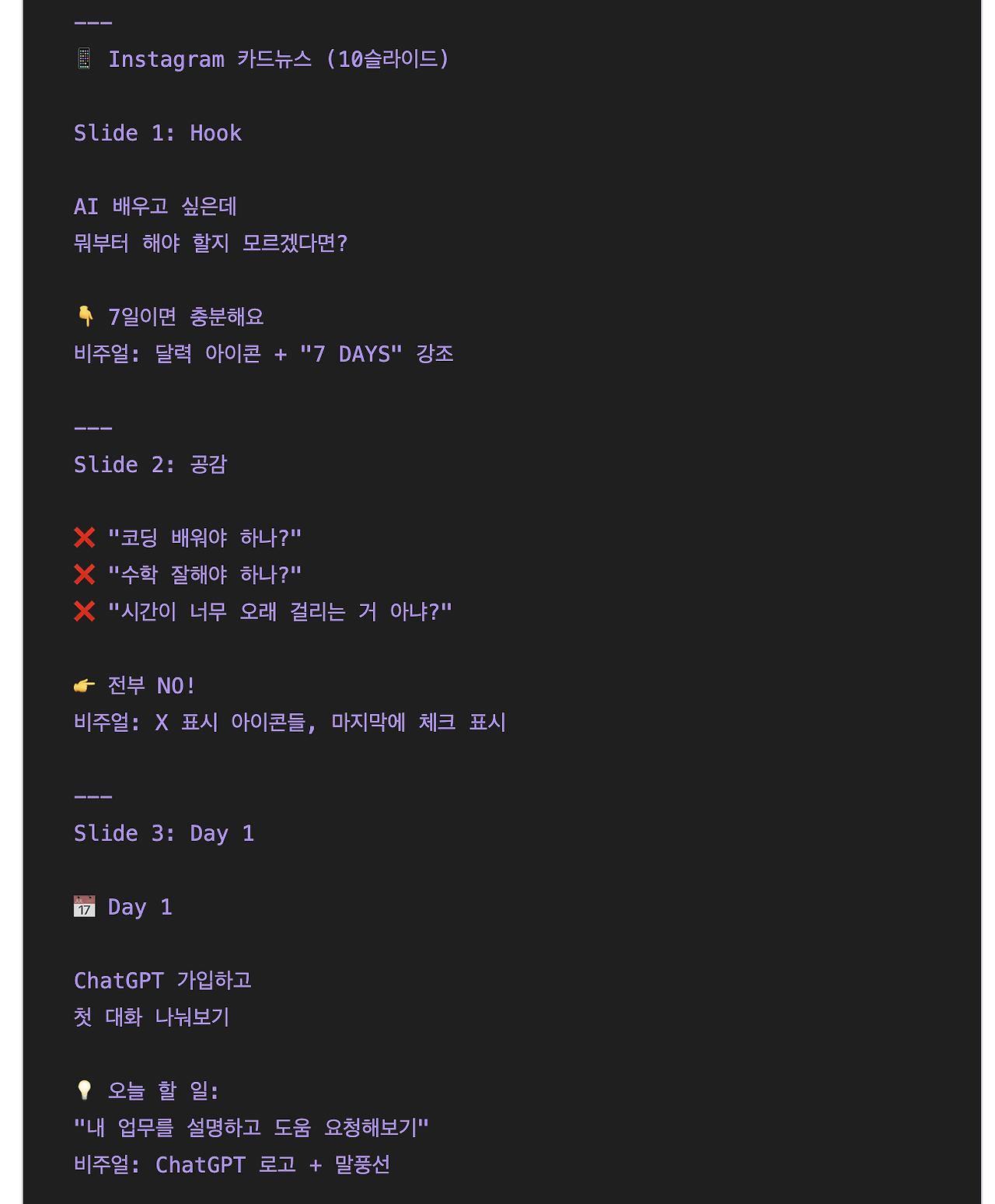 일반 텍스트로만 구성되어 있지만 AI가 제목 구분, 계층, 불렛 등을 이해할 수 있으니 더 우리의 주문을 더 잘 알아들을 수 있게 되는 것이죠.