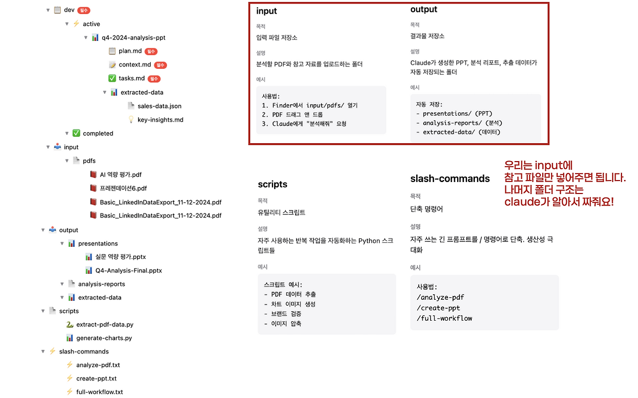 : 참고 자료 기반 PPT를 자동으로 만드는 업무를 예시로 제대로 스킬, 에이전트 등을 구성한다면 아래와 같이 폴더와 지침이 구성되면 좋습니다. (복잡한 작업이 아니라면 이렇게까지 구성 안해도 되지만요!)