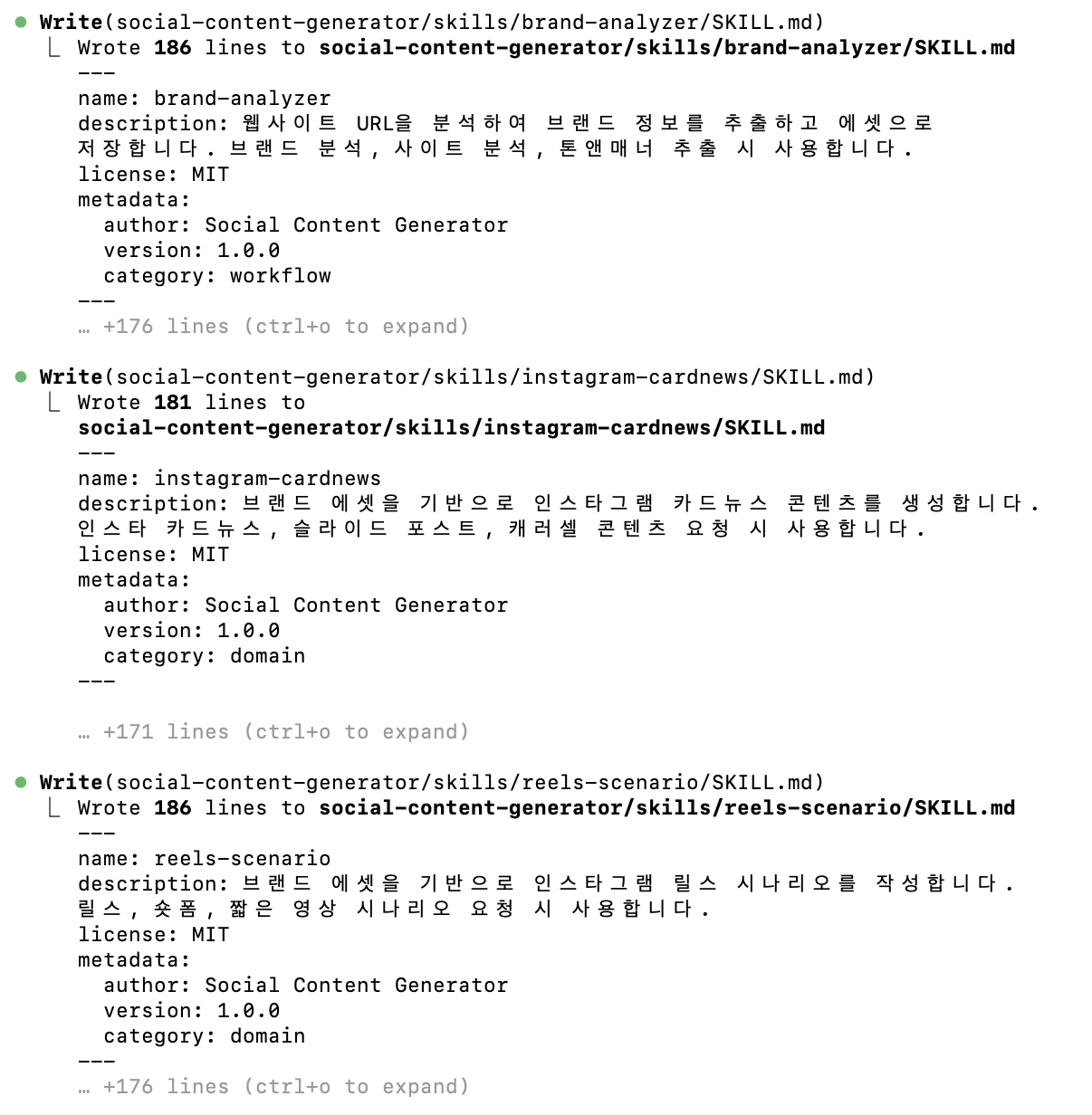 승인을 위해 계속 1을 누르다보니 똑똑한 에이전트와 스킬들을 만들어줍니다.