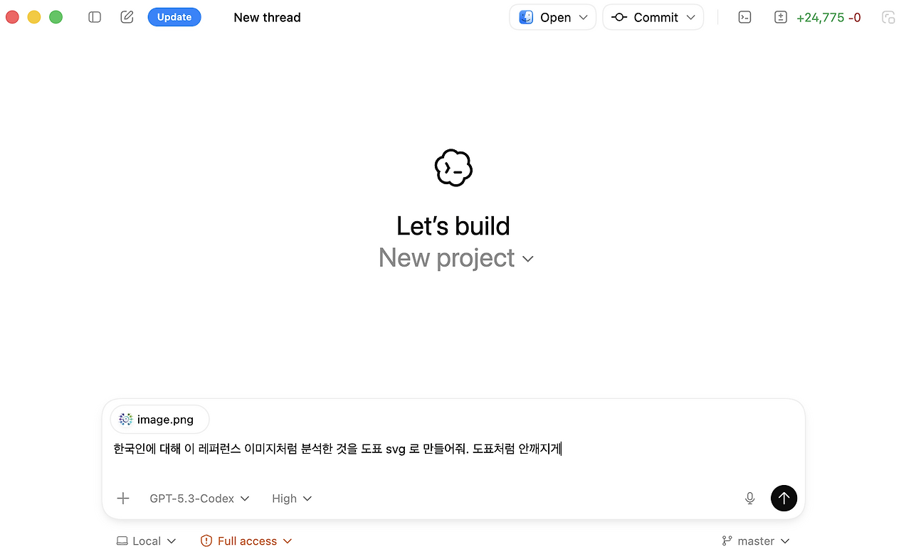 가장 상위 모델인 GPT-5.3-Codex를 선택했어요.