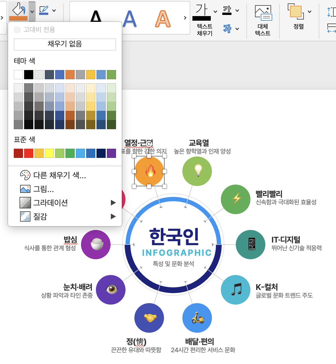 텍스트 수정도 가능할 뿐 아니라, 도형 색도 바꿀 수 있죠.