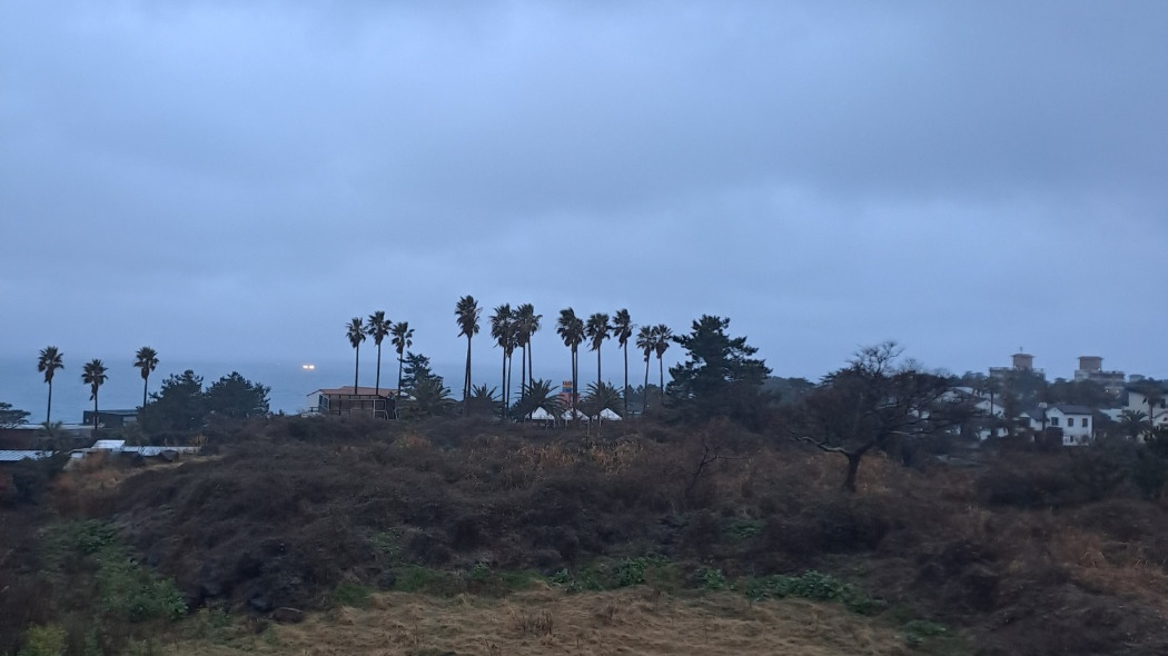요즈음은 핸드폰 앱에서 주소만 치면 어떤 길도 찾아갈 수 있으니 얼마나 편리한 세상인지 생각할수록 놀랍다. 셋째 딸은 밖으로 나와 "웰컴" 하면서 씩씩한 목소리로 환영을 한다. 그 모습이 얼마나 설레고 기쁜지, 에 들어가니 멀리 바다가 보이고 야자나무는 바람에 흔들리고 있다. 제주에 온 걸 실감하게 하는 것은 먼저 야자나무다. 바람은 많이 불고 비는 여전히 내리고 있다.