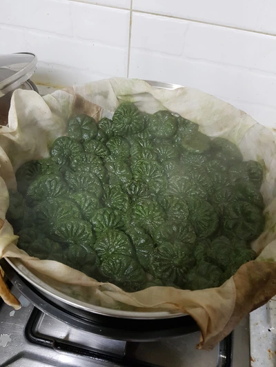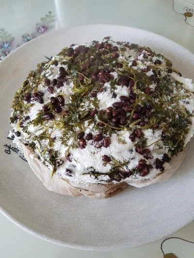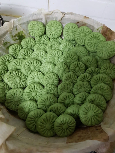 불려 논 쌀에 쑥을 넣어 반죽해서 전통 떡살로 찍어 놓은 떡 모양 전통 떡살로 찍어 찐 쑥절편