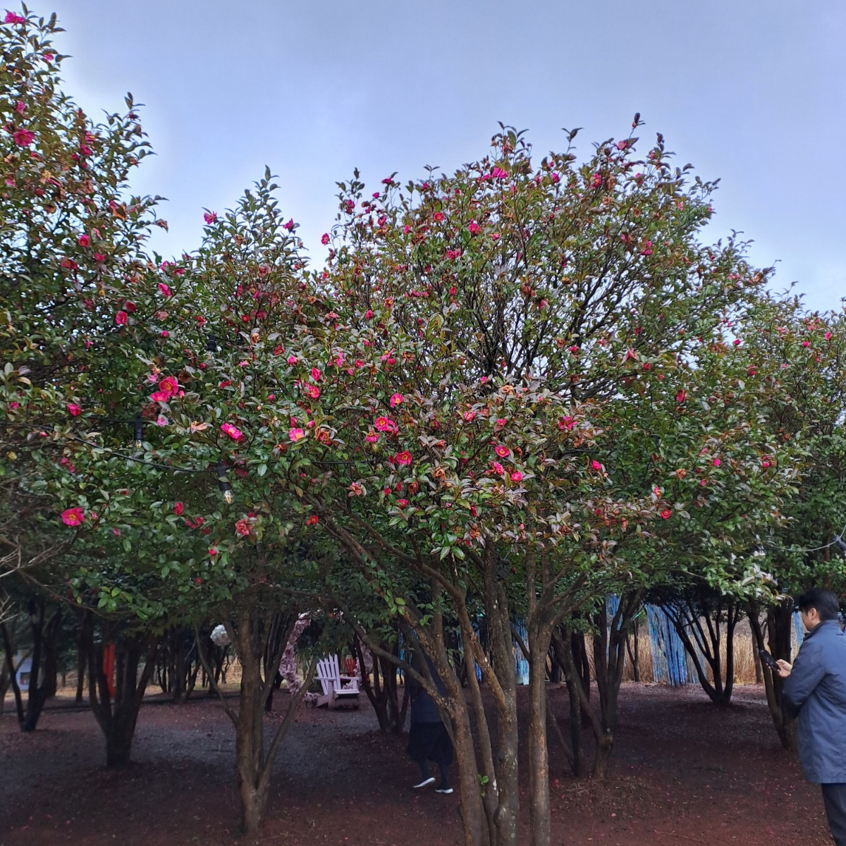 넓은 잔디가 있는 광장 동백꽃 숲