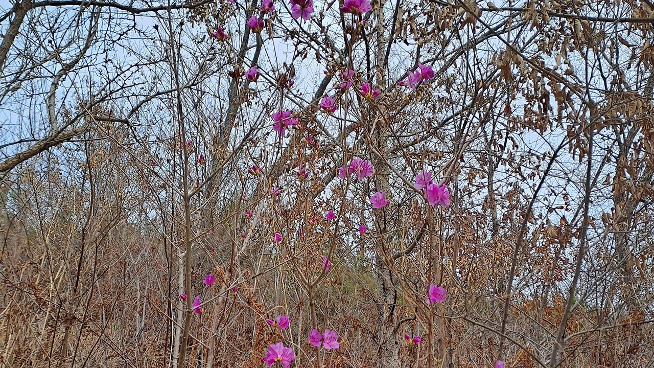 정말 오랜만에 자연 속에 숨을 쉬니 기분이 상쾌하다. 한참을 걷다 보니 어 진달래 꽃이 피었다. 아니 어느 사이, 군락은 아니지만 산자락 멀리 군데군데 꽃 핀 것이다. 깜짝 놀라 휴대폰을 꺼내여 사진을 찍었다. 지난가을에 오고 나서 처음 와 보는 공원을 소리 없이 자기들 자리에서 꽃을 피워내고 있다. 자연은 언제나 순리데로 의연히 자기 자리에서 자기 몫의 삶을 살아낸다.