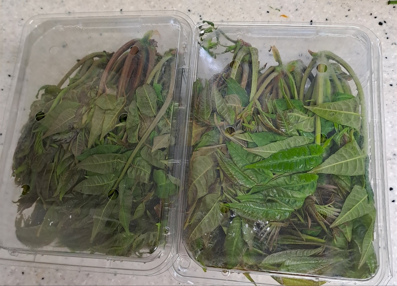 다음 날 오후 다시 볼일이 있어 마트에 들렀다. 그런데 거짓말처럼 가죽나물 값이 2900원이라니. 내 눈을 의심하고 다시 보아도 그 가격이 맞다. 어제 가격표 위에 덧씌워 가격표를 붙여 놓았다. 그 정도면 사 먹을 만하지 하는 마음으로 두 팩을 사가지고 와서 단단한 줄기는 자르고 씻어 냄비에 소금 한 줌 넣고 물을 끓였다.