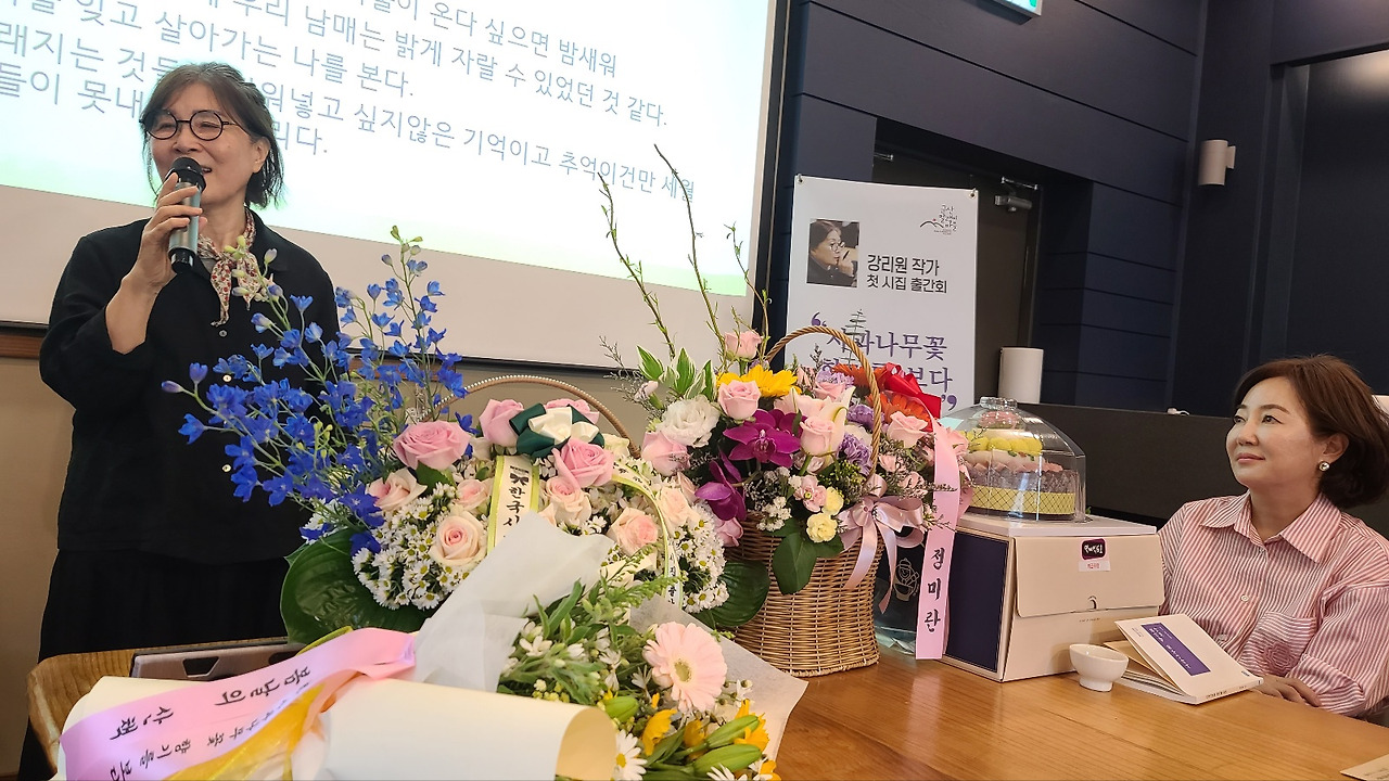 첫 책 첫 시침을 내는 시인님의 마음은 얼마나 설렐까? 짐작이 간다. 사회자의 소개와 시인님의 소감을 말하는 부분에서는 연신 눈물을 훔친다. 그 모습을 바라보면서 나도 울컥하며 눈물이 난다. 사람은 누구나 자기만의 이야기가 있다. 가장 기쁜 순간에도 나만이 아는 내 이야기가 가슴에 맺혀 오리라.