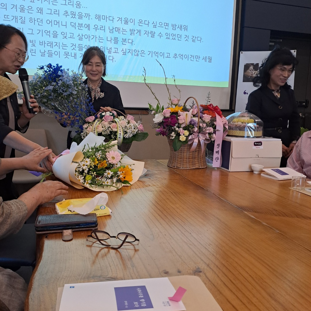 언제나 맏며느리 같은 우리 총무님 떡케이크 준비도, 행사장을 빛나게 해 주는 꽃 천사 박선회 선생님의 꽃다발도 각별하고 예뻤다. 그곳에 모인 분 모두는 온 마음으로 축하해 주고 응원을 보낸다. 내 주변 사람들이 행복하면 나도 행복해진다. 사랑을 서로에게 메아리가 되기도 하는 게 진리다. 내일도 모레도 리원 시인님의 건필을 빈다.