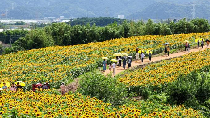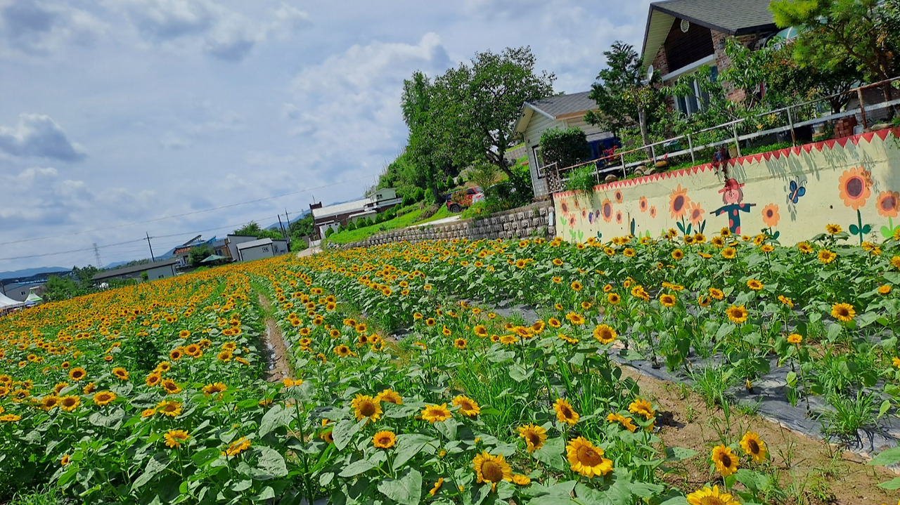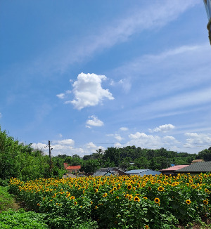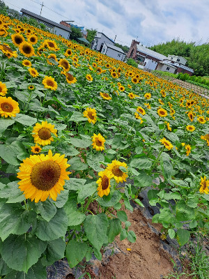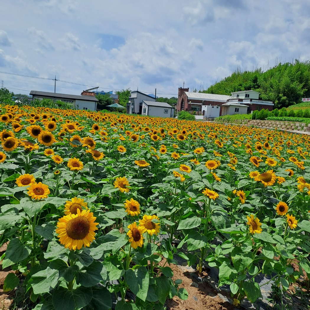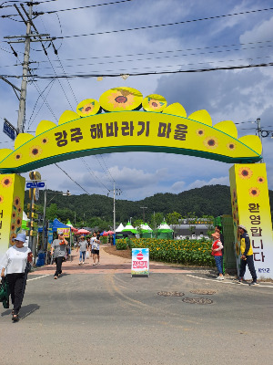 전주에서 출발해서 무려 몇 시간을 차를 타고 왔는지, 강주 해바라기 마을 축제장에 도착을 했다. 햇살은 따갑고 날씨가 너무 덥다. 그런데도 축제장은 사람과 차로 넘쳐난다. 해바라기는 키가 큰 해바라기가 아닌 키가 작은 해바라기다. 지금 막 피어난 해바라기꽃이 천지다. 동네에 접하고 있는 해바라기 축제장은 동네 주민들이 살고 있는 곳, 마을 안 밭에 심어 놓아 마치 마을 축제 같다. 축제장에서 빠질 수 없는 먹거리와 기념품들도 사람들 발걸음을 멈추게 한다. 나는 걷기 힘들어 바람이 통하는 의자에 앉아 지나가는 사람 구경을 하고 있다.