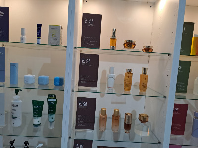 오설록 연구소 안에 나무와 허브식물들 전시해 놓은 화장품들