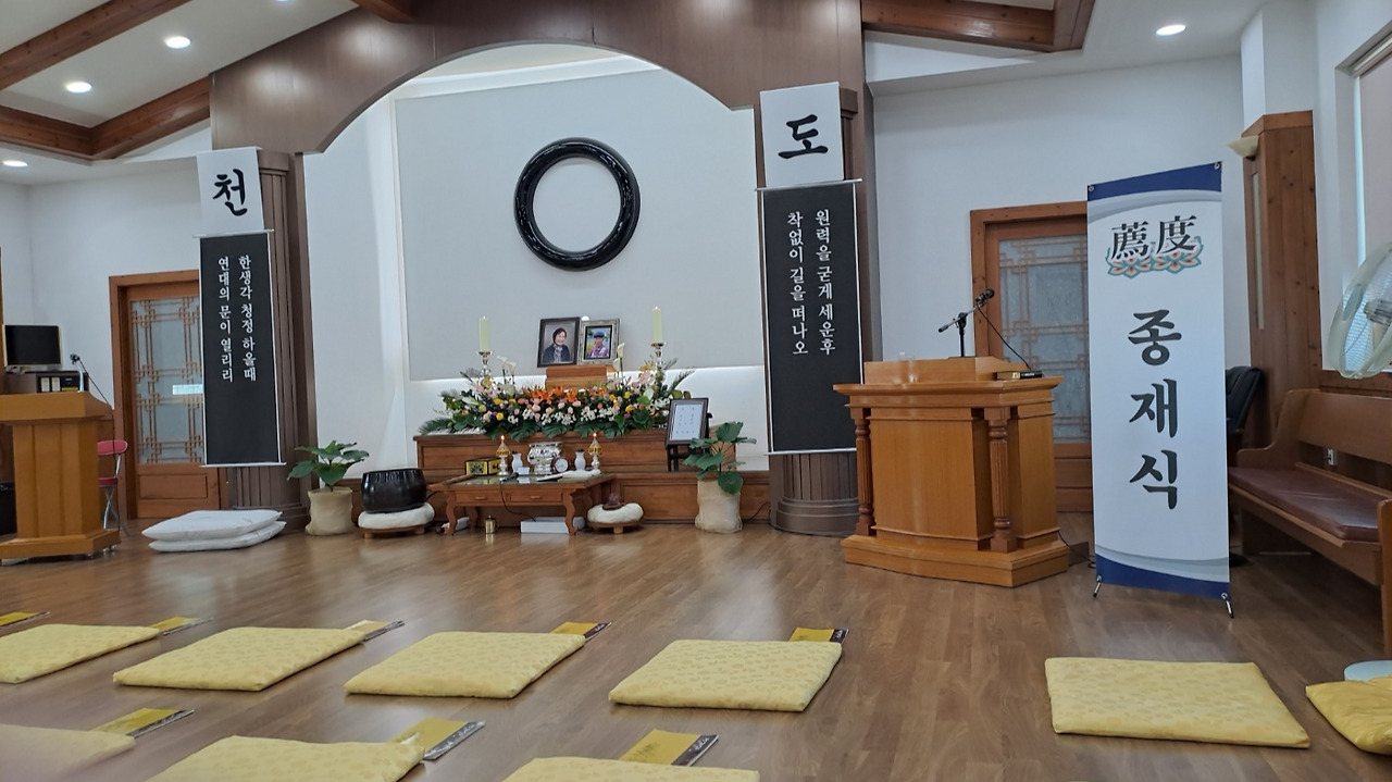 내가 일어나는 모습이 불편한 걸 언제 보셨는지, 교무님은 의자를 가져다주시고 의자에 앉도록 배려해 주신다. 말씨도 사근 사근 친절하시고 종교인이 갖추어야 할 덕목을 다 갖추신 듯하다. 그 모든 것이 정신적인 수행에서 나타는 몸짓일 것이다. 법당 안은 정말 정갈한 느낌이 들 정도로 정돈이 잘 되어있다. 노란 방석도 독경집과 안 내지를 놓아줄 맞추어 깔아 놓았다.