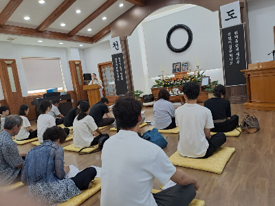 우리 집안과 원불교의 인연은 남편의 큰 누나로부터다. 큰 누나는 지극 정성으로 원불교를 믿어 왔던 종교다. 그런 연유에서 돌아가신 뒤에도 시누님 부부영정 사진이 원불교 법당 안에 모셔져 있다. 시어머님 시아버님도 위패도 원불교 이곳에 모셔 놓았고 가족들도 짧은 시간이 지만 원불교에 참여했던 인연이 있는 종교다. 젊은 교무님의 안내에 따라 가족들 모두 자리에 앉는다. 다리가 불편한 나는 앉았다 일어나는 일도 쉽지 않다.