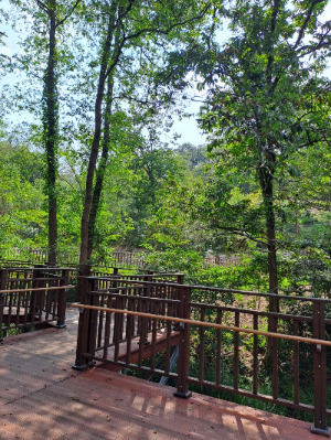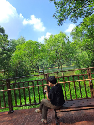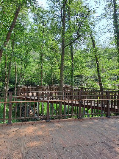반가운 것은 온전하지는 않지만 내가 걸을 수 있다는 것이다. 아파 본 다음에 찾아오는 평소의 일상이 얼마나 감사한지 새삼 알게 된다. 오랜만에 찾아온 공원 산책길은 다른 면모를 갖추고 우리를 맞이한다. '무장애길'이란 데크 길이 월명 호수를 한 바퀴 도는 길이 마련 되어있다. 나무 사이로 걸어가는 테크길은 상쾌하고 기분이 좋다.