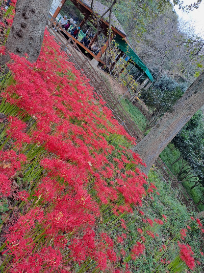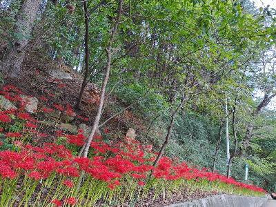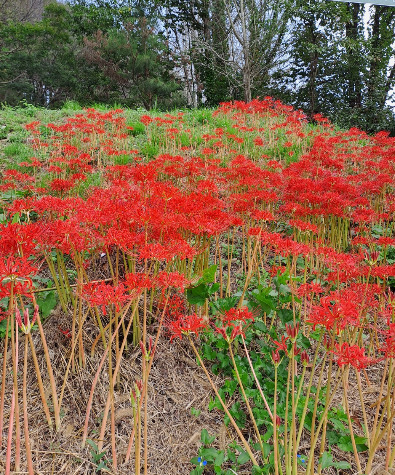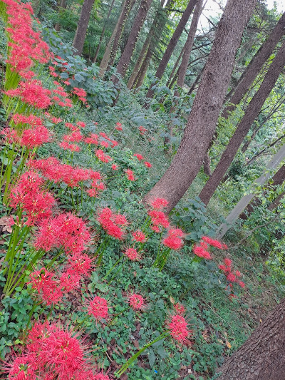 오랜만에 공원 입구에 도착하니 나뭇잎은 아직 푸르지만 공기는 상쾌하다. 조금 걸어가니 빨간 꽃 무릇이 산책길 양옆에 피어 아름답다. 사람들이 많아 깜짝 놀랐다. 웬일이지, 생각해 보니 아하! 국군의 날 휴일이라서 산책 나온 사람들이 많았던거다.