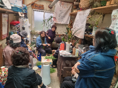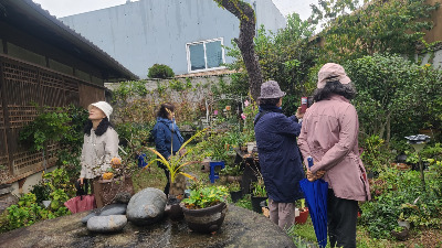 시장구경 갔던 팀도 합류를 하고 사온 쪽파 껍질을 다듬으며 차도 마시고 시장에서 사 온 단감도 깎아 먹으며 수다를 떤다. 아, 이런 게 사람 사는 맛이다. 그래 사람은 사람 냄새를 맡고 살아야 사는 맛이 나는 거다. 꽃 천사 꽃집에는 신기하고 기이한 꽃들도 많고 집안의 소나무는 몇십 년이 되었는지 엄청 큰 나무가 집안의 수호신처럼 우뚝 서 있다.