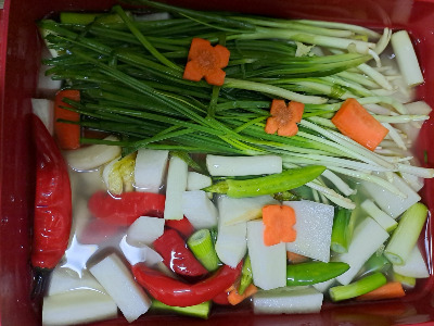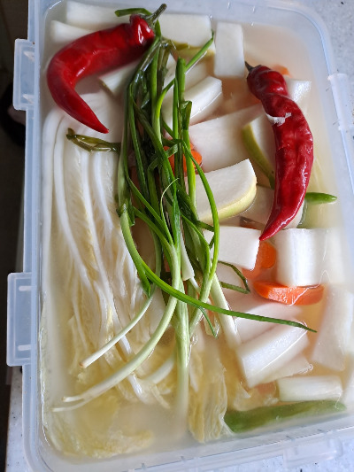 동김치를 더 담기 위해 무를 실 하고 단단한 걸로 구했다. 쪽파와 갓도 약간 배추 한 포기 당근, 배하나, 생강 마늘 대파 재료는 끝이다. 동감치 담는 레시피는 유티브 보면 숫하게 많다. 중요한 것 한 가지는 정성 스런 마음과 국물 간만 잘 맞추면 발효되고 맛있는 동김치가 된다. 말 그대로 환상이다. 그 어떤 인공 첨가물이 아닌 자연의 맛이라서 그럴 것이다.