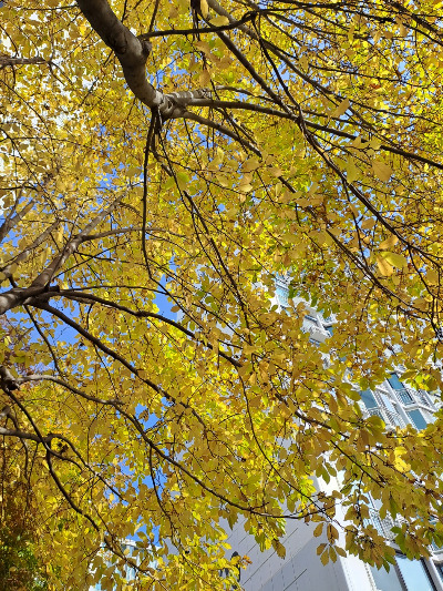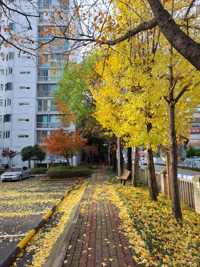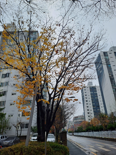 다른 지역 작가님들의 눈 소식이 전해 지고 티브이 뉴스에서도 여기저기 눈이 많이 왔다고 하는데 이곳은 아직이다. 저 노란 잎들이 나무를 보호하려는지 가을을 보낼 생각을 하지 않는다. 나는 날마다 가을과 겨울을 마주 한다. 날씨는 추워 겨울 맛을 느끼는데 아파트 주변은 단풍들이 남아 가을이다.