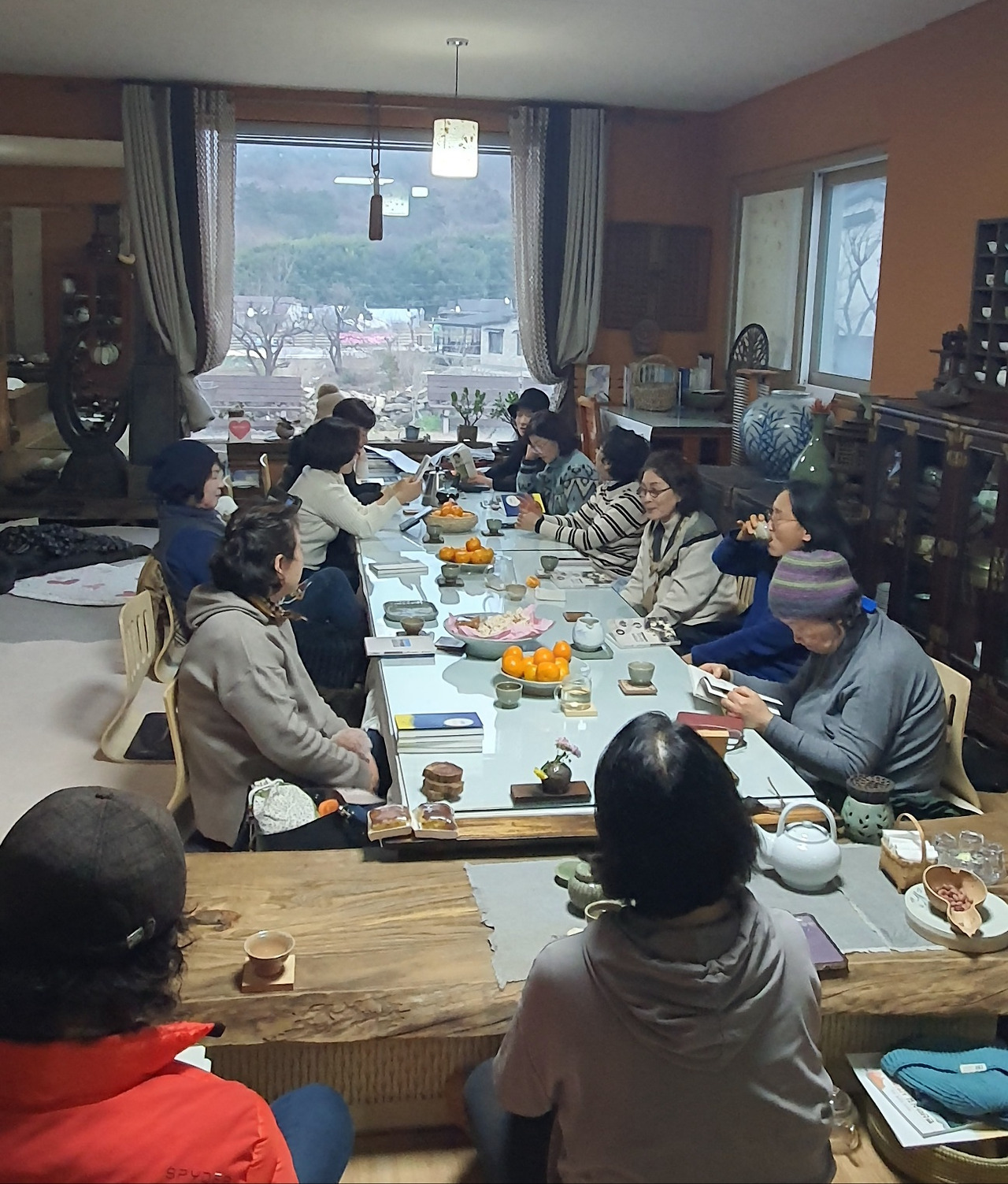 팽주가 앉은자리에서 마주 보이는 산자락이 아름답다. 무릉도원이 따로 없다. 주변 풍경에 마음이 차분하고 숙연해진다. 교수님은 "봄 산 벚꽃이 필 때면 아름다워요." 그 말씀에 수긍이 간다. 봄이 오면 다시 와 차 한잔하고 싶다. 삶이란 소소한 일상 속에 좋아하는 일을 하면서 소박하게 살아가는 것도 큰 행복이리라. 내가 꿈꾸던 삶을 교수님은 실행하고 계신다.