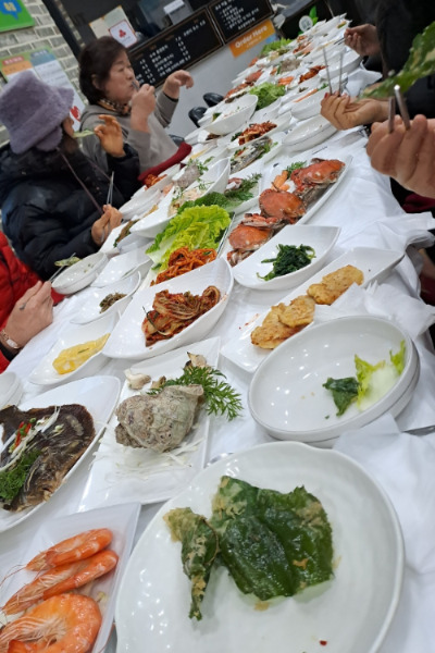 한 시간 남짓 달려 변산 채석강에 도착해 예약해 놓은 식당에 모여 만찬을 시작했다. 회장님의 덕담 건배사에 우리는 목소리 높여 파이팅을 외친다. 바다에서 나오는 건 모두 식탁에 올라오는 듯하다. 회에서부터 음식이 쉴 사이 없이 계속 나온다. 오늘은 맛있는 건 다 먹는 날이다. 역시 사람은 맛있는 음식을 먹을 때 행복하다. 서로가 덕담을 하면서 먹기에 여념이 없다.