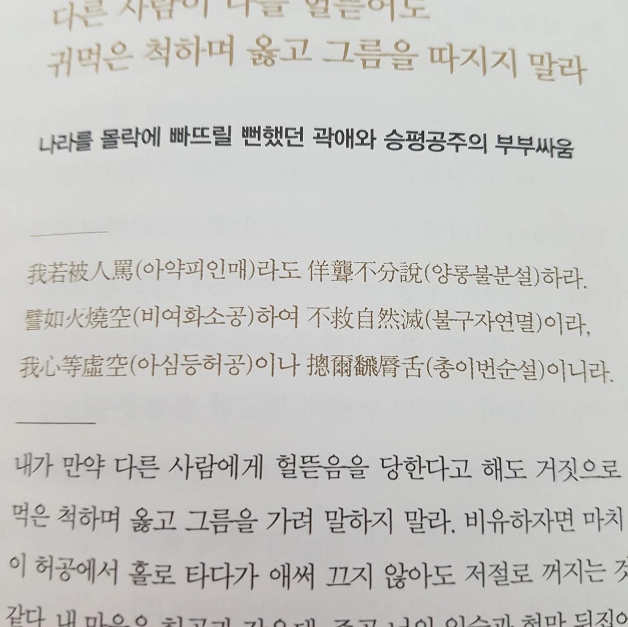 내가 만약 다른 사람에게 헐뜯음을 당한다고 해도 거짓으로 귀를 먹은 척하며 옳고 그름을 가려 말하지 말라. 비유하자면 마치 불이 허공에 타다가 애써 끄지 않아도 저절로 꺼지는 것과 같다. 내 마음은 허공과 같은데 , 줄곧 너의 입술과 혀만 뒤집어질 뿐이네.