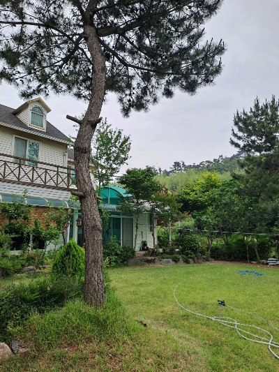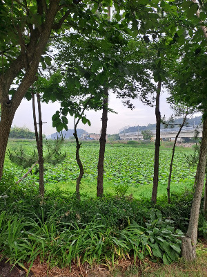 마트에서 필요한 걸 사고 남편 차로 전원주택인 시인 이신 선생님 댁을 찾았다. 그 집에 들어 서면 기분부터 좋아진다. 넓은 잔디 마당과 그 끝에 드 넓은 연꽃 방죽, 집 울안에 있는 나무들만 바라보아도 마음이 포근해지며 휠링이 되는 집이다. 선생님은 마당 잔디밭을 돌며 운동을 하고 계신다.