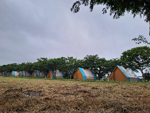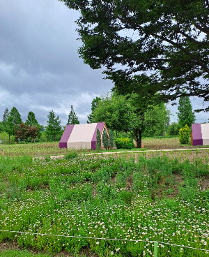 숙소도 특이하다. 마치 텐트를 쳐 놓은 것 같은 모양인데. 그 안은 휠링 할 수 있는 아담하고 아늑한 공간이다. 얼마나 아기자기 한지. 혼자 아니면 둘만이 쉬고 잠자는 공간이다. 생전 처음 체험해 보는 숙박시설이라서 감정이 묘하다. 숙소 앞에는 물이 있고 드 넓은 잔디는 우리 마음을 고요히 하고 사색하기 알맞은 공간이다.