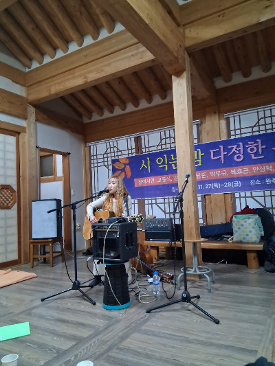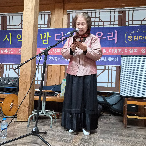 "저는 시가 좋아 오늘 이곳에 참여했고 여러 시인님을 뵙고 부자가 된 느낌입니다. 매일 시를 필사해야 하는 저는 시를 고르는 일도 늘 신경 써야 했습니다. 시가 익어 가는 늦가을 낭만이 흐르는 밤입니다. 저는 82세 글 쓰는 작가 이숙자입니다." 뭐가 그리 위풍당당한지 나이는 말을 무심코 말하고 나서 생각하니 쑥스럽다. 준비 없이 한 말이다.