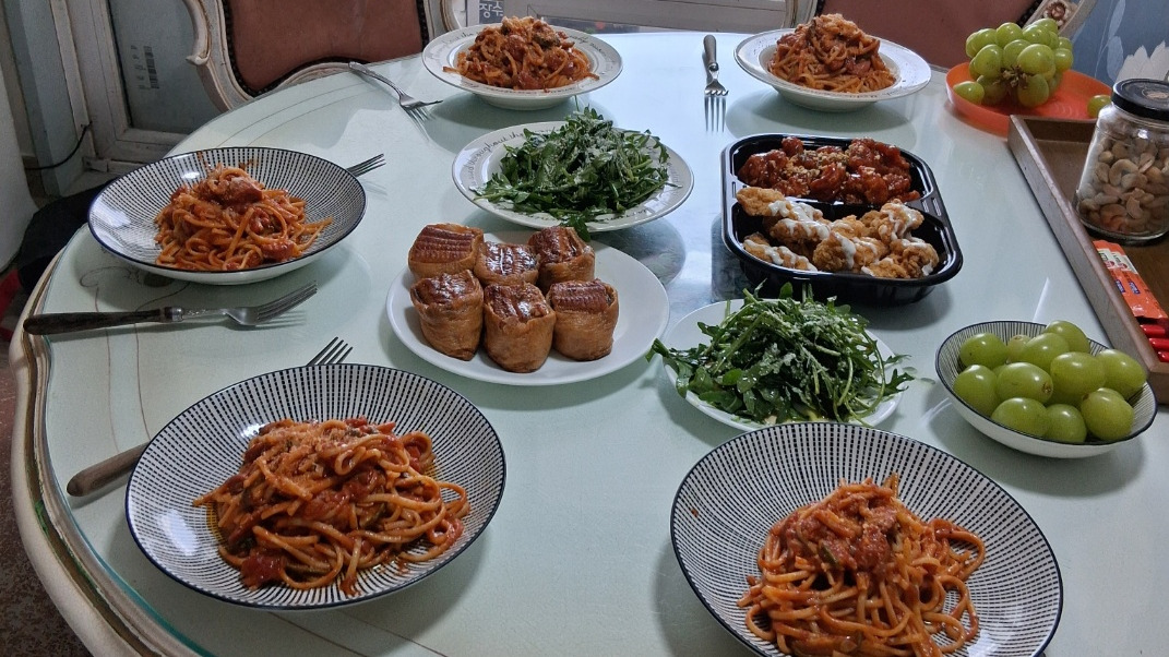 다음날, 먼저 온 둘째네 짐 챙겨 보내고 나니 다음 팀은 셋째 딸네 가족 손자들이 왔다. 몇 달 사이 얼마나 자랐는지 아주 의젓한 모습에 반갑다. 그다음 날은 막내딸과 사위가 먹을 것 준비를 해서 왔다. 남편 좋아하는 연어를 잔뜩 진공 포장해서 매일 드시라고 가져오고 조카들과 우리 장어 초밥에 스파게티 준비까지, 세프 막내 사위 때문에 입 호강을 한다. 차 없는 우릴 위해 큰 마트도 가서 생필품도 사다가 주고 집에서 막내 사위가 해준 스파게티가 레스토랑 맛과 다르지 않다.
