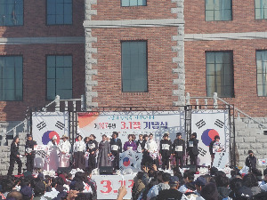 군산 3,1 운동 100주년 기념관 앞 무대는 태극기를 들고 거리 행진을 마치고 돌아온 시민들이 잔디 위에 마련한 의자를 꽉 채운다. 모두가 태극기를 든 군중에게도 그 열기가 느껴졌다. 식전 행사로 우리 시 낭송회원들은 모두가 당당하고 의연한 모습으로 무대에 올라 혼신의 힘을 다해 3.5 운동이 일어났던 군산 이야기를 연기했다.