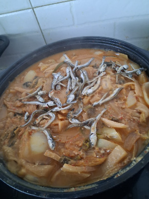 그다음 멸치를 한 주먹 넣고 거의 한 시간쯤 오래 푹 끓이면 부드러운 김치찜이 완성된다. 오래전부터 먹어왔던 묵은지 찜은 딸들도 좋아한다. 멸치를 넣고 오래 끓인 깊은 맛이다.