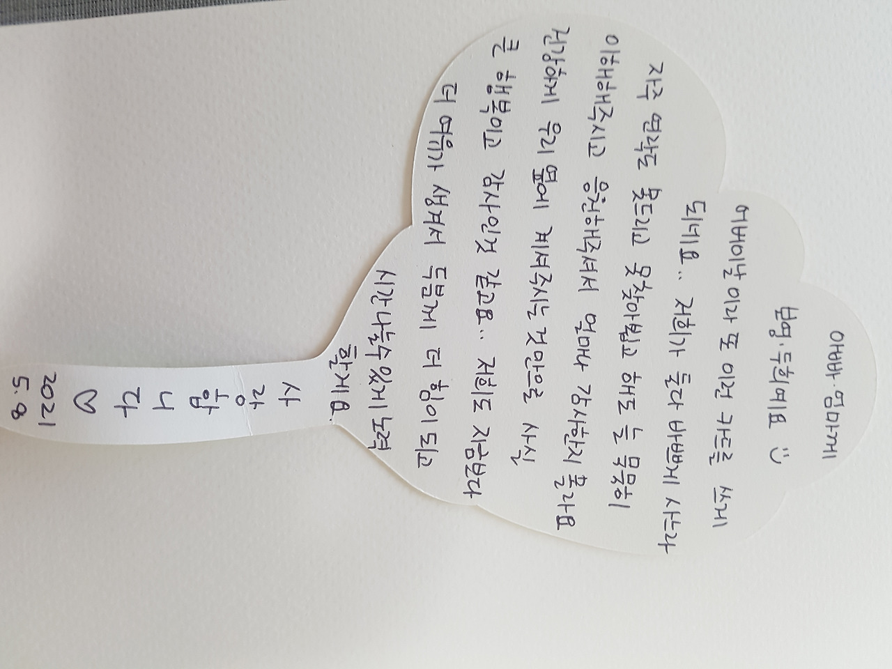 이제는 모두 헤어져야 할 시간 막내딸이 어버이 날이었다고 손 편지를 준다. 손편지는 언제나 정겹다. 막내는 역시 막내다. 3박 4일 딸들 가족과 함께 한 시간이 아쉽지만 헤어져 모두가 각자 자리에서 살아가야 한다. 다음에 만날 것을 기약하며 우리 부부를 둘째 딸네가 터미널에 까지데려다주고 돌아갔다.