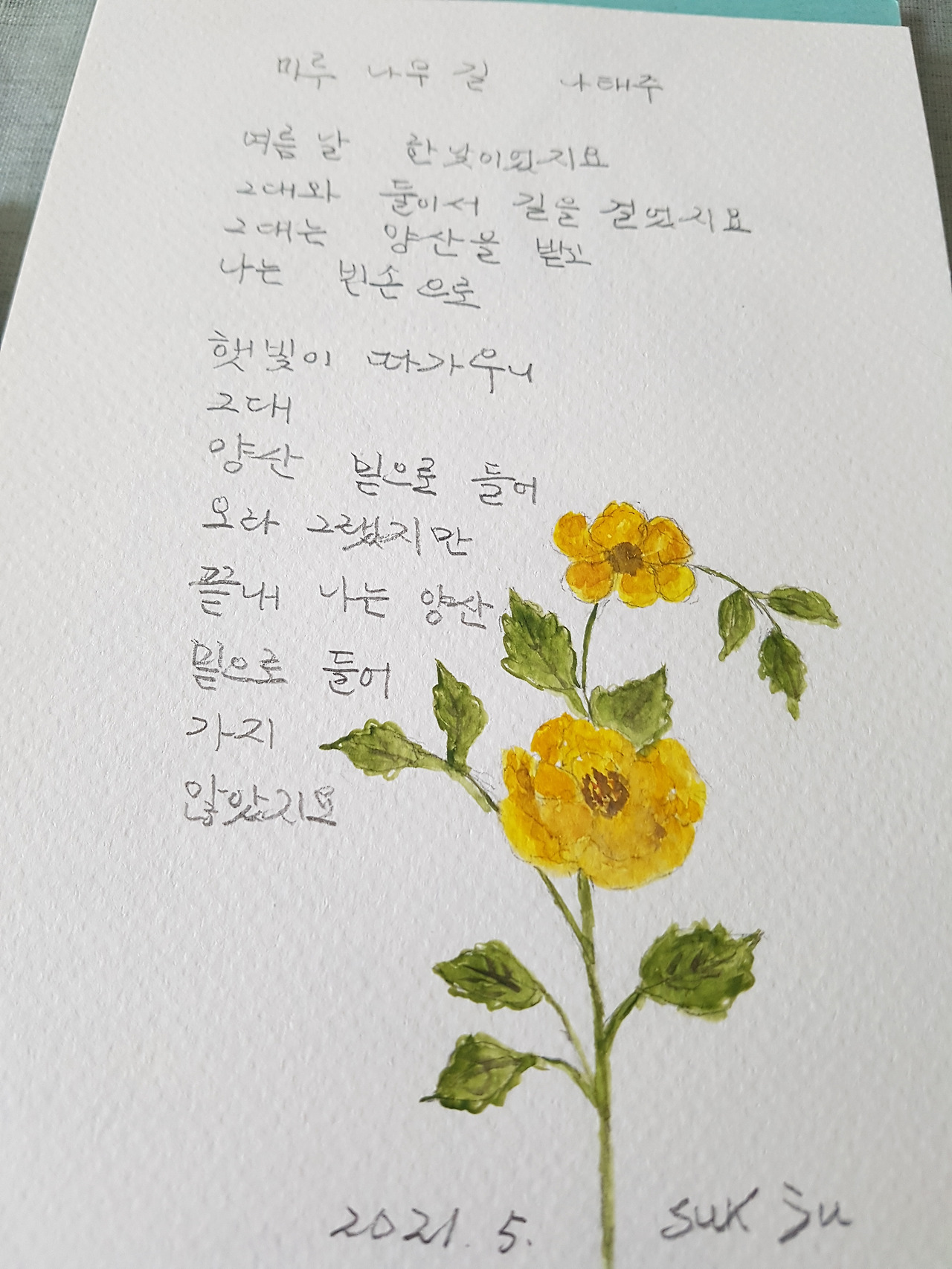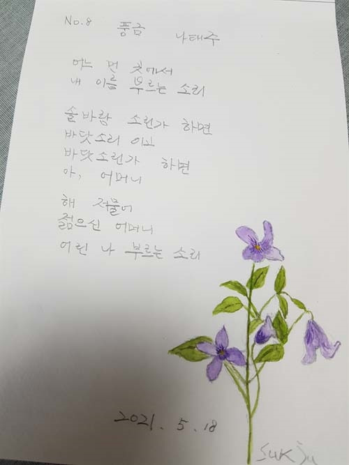 5월부터 시 필사를 하기 시작했다. 8명이 하루 한 편씩 시를 필사해서 카톡방에 올린다. 카톡방 이름은 '책방 향기'라고 명명하고서. 모두가 시를 좋아하는 분들이다. 모든 분이 새벽시간 시를 올리고 하루를 시작한다. 조금 바쁘게 부지런을 떨면 하루가 선물처럼 행복하다.